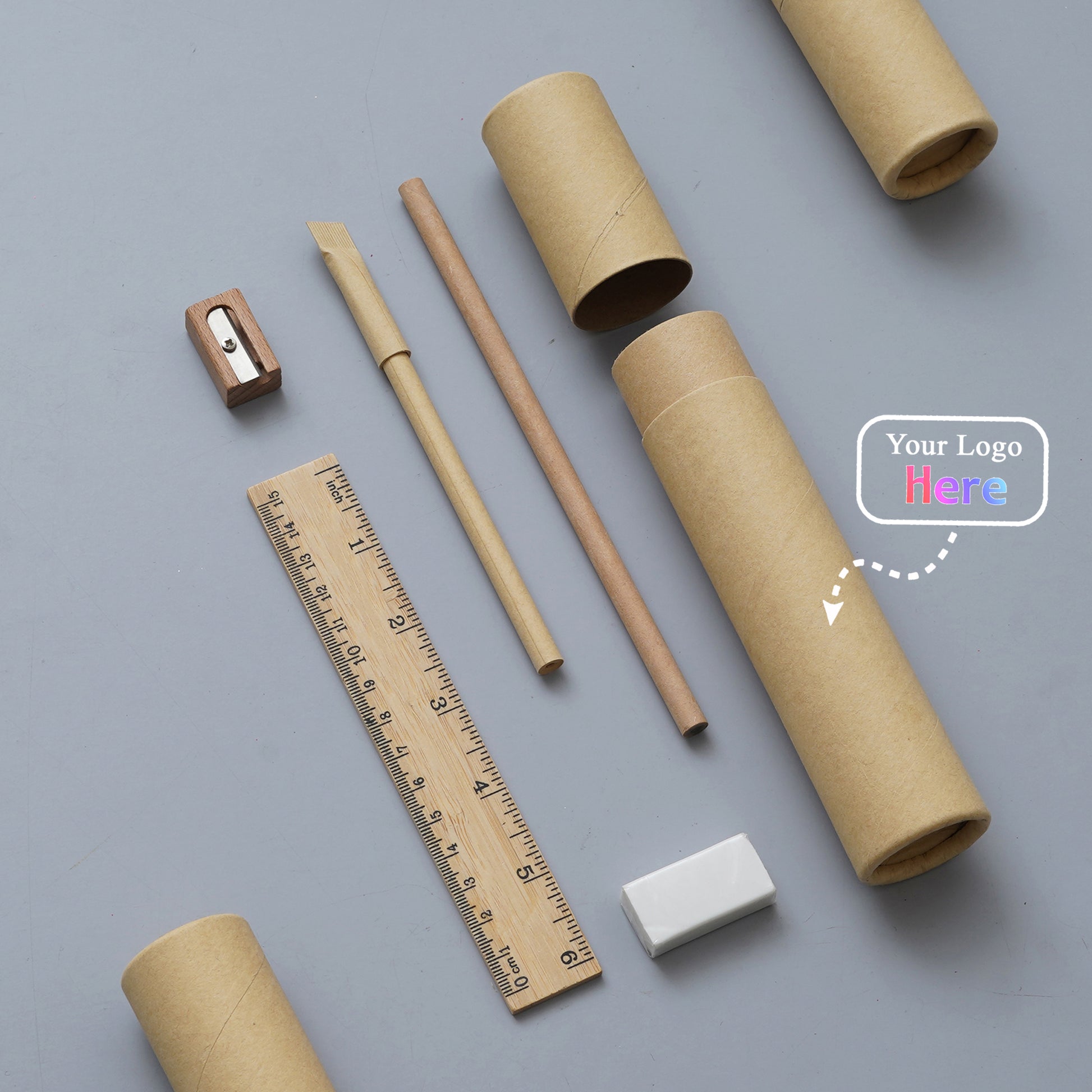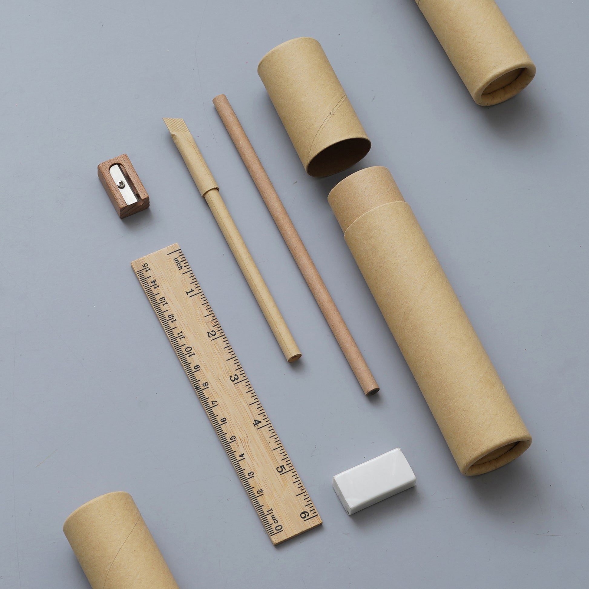 Make a sustainable statement with this eco-friendly stationery kit. Neatly packed in a recyclable kraft tube, this 6-piece set includes all essential desk tools made from wood, paper, and other environmentally conscious materials. Ideal for corporate gifting with a green message.