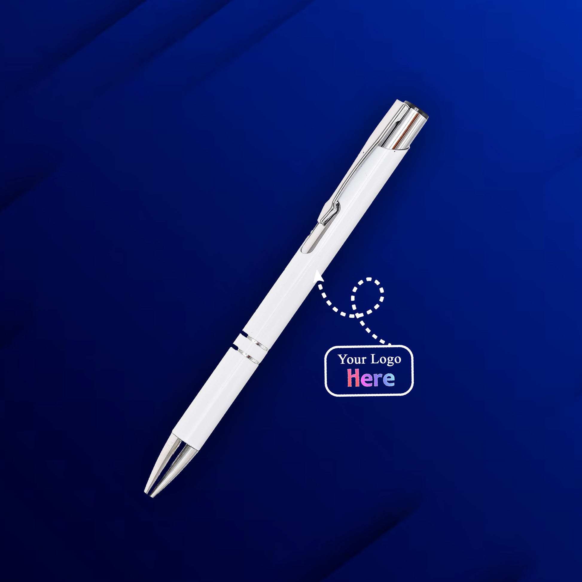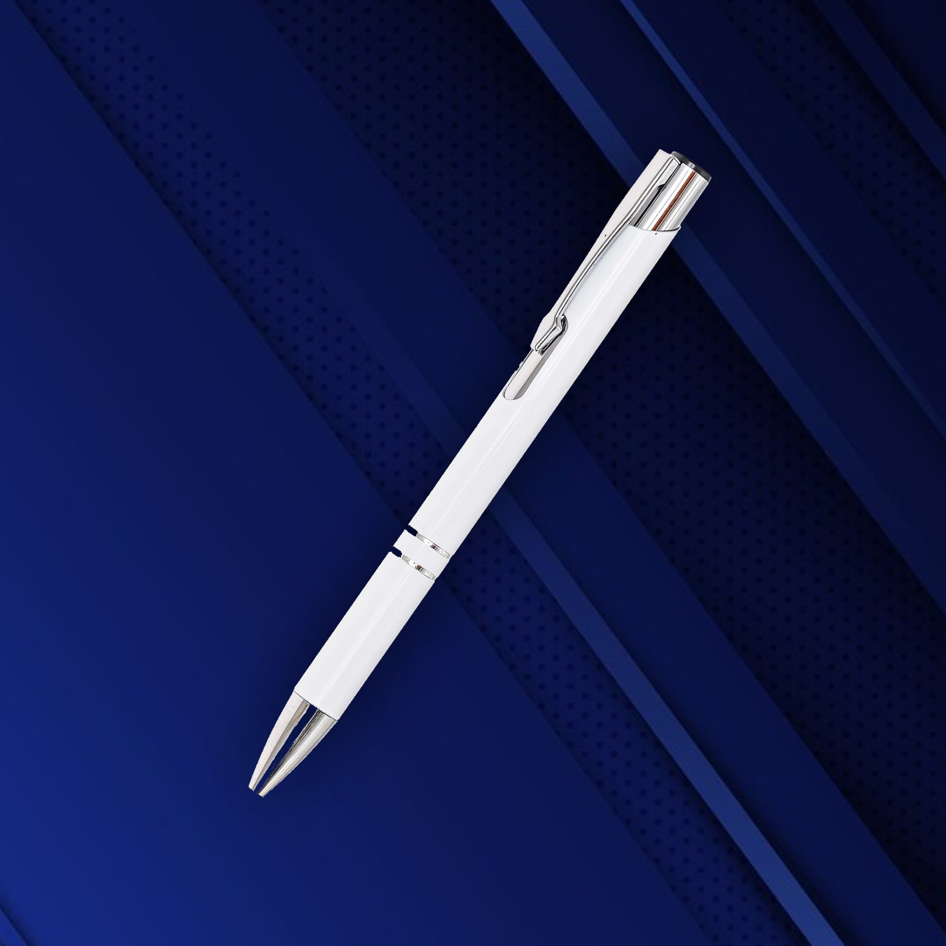 Make a lasting impression with this elegant metal ballpoint pen, designed for both style and substance. With its glossy white barrel, gleaming chrome details, and smooth-writing performance, it's perfect for premium gifting and corporate branding.
